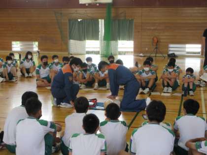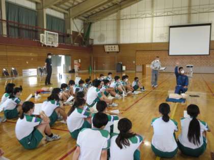 3限に、2−3・2−4が心肺蘇生法を学びました。 しっかり説明を聞いています。