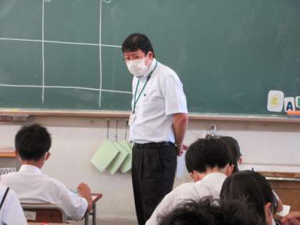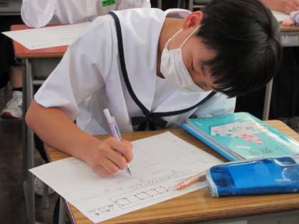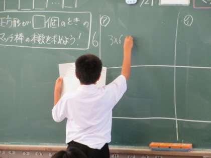 数学の授業です。正方形が□個のとき、マッチ棒は何本必要だろう?「1、2、3・・・」数えてもよいですが、式を立てて求めるときは?いろんな考え方を出し合いました。