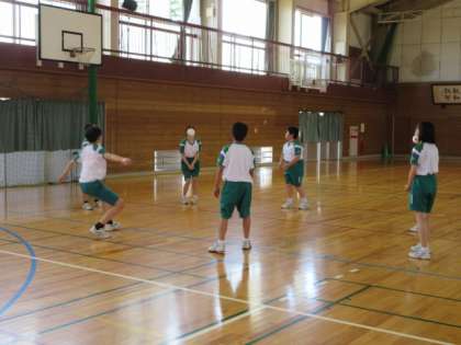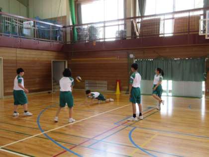 1−3 公開日 2022/06/29 更新日 2022/06/29 第1学年 保健体育の授業です。 熱中症対策として、マスクを外して活動しています。 バレーボールの円陣パスでは、つなげるために必死にボールを追って、汗だくです。水分補給と汗の始末まで、しっかり行いましょう。