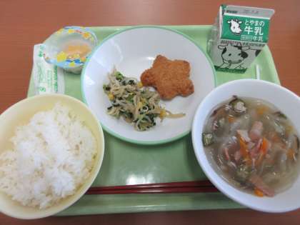今日の給食 公開日 2022/07/01 更新日 2022/07/01 給食 七夕メニューです。 天の川スープは、「春雨」で透明な川の流れを、そして「オクラ」は星を表現しているのでしょうか!? ごはん 牛乳 星形メンチカツ コーン和え 天の川スープ 七夕ゼリー