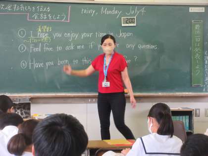 英語の授業です。 初対面の相手に歓迎する気持ちを伝える工夫をします。