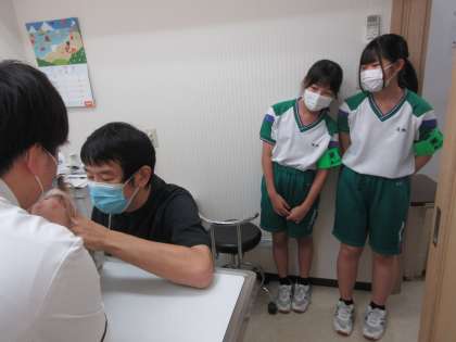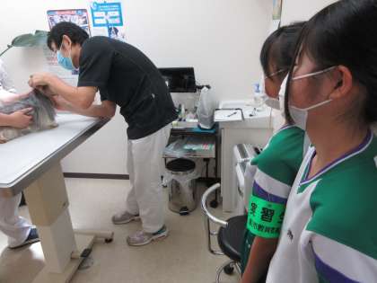 「社会に学ぶ『14歳の挑戦』」その3 公開日 2022/07/05 更新日 2022/07/05 14歳の挑戦 廣瀬動物病院での活動です。 動物のお薬をつくったり、診察を見学したりしています。ワンちゃんが泣かずに注射されていることに感動!