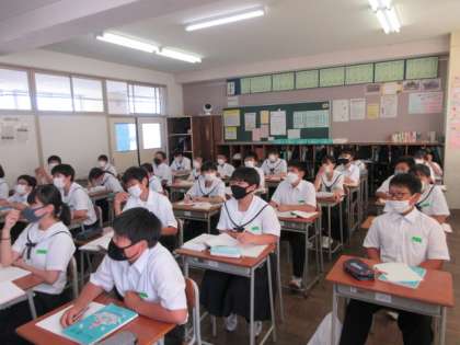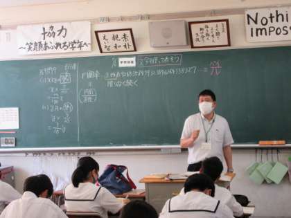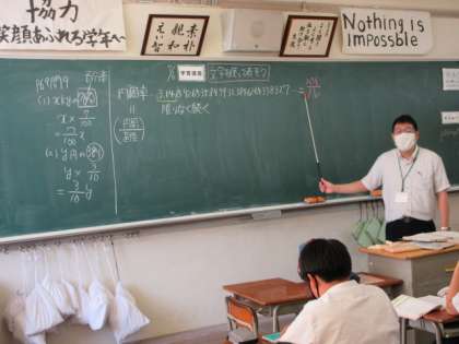 1−5 公開日 2022/07/06 更新日 2022/07/06 第1学年 数学の授業です。 円周率は、3.1415926535・・・・・小数では正確に表すことができないので、文字π(パイ)を使って表します。