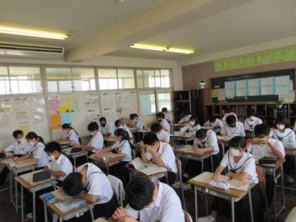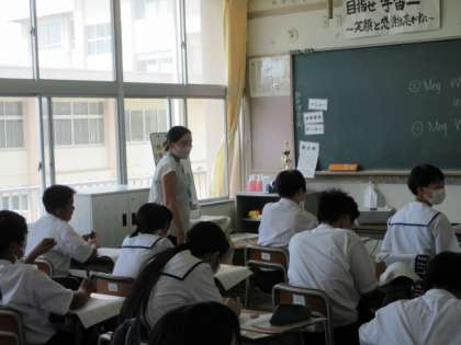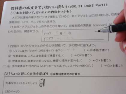 英語の授業です。 リスニングを聞いて、質問に答えています。 かばんの中身は何でしょう?