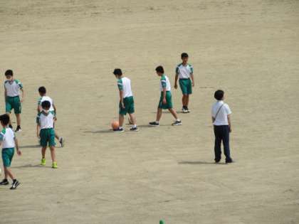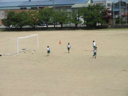 保健体育の授業です。 暑い中、元気にサッカーをしています。 ゴールの隅を狙って、シュート!!
