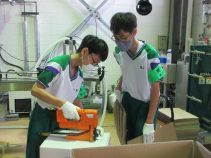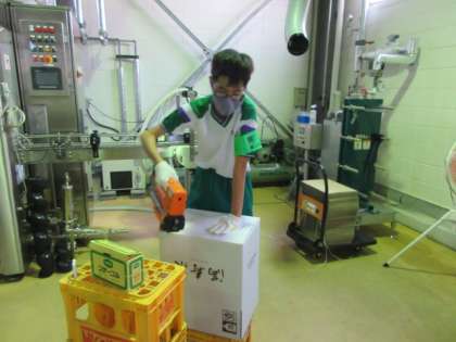 「社会に学ぶ『14歳の挑戦』」その24 公開日 2022/07/06 更新日 2022/07/06 14歳の挑戦 桝田酒造店での活動です。 お酒を入れる段ボールを組み立てました。初めて見る機械に興味津々です!