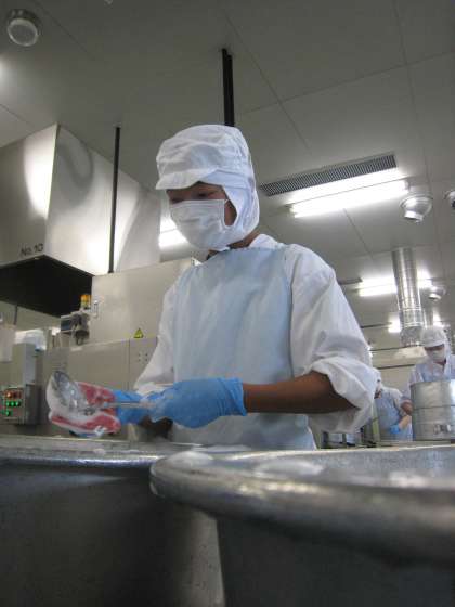 2日目の北給食センターでの様子です。使用した調理用具等を丁寧に洗浄しています。頭からつま先まで完全に指定の服装!作業前には、さらに全身にエアシャワーを浴びました。すでに、大人の本当の職員と見分けがつきません。もう、プロ級です!作業場には決して一般の人は入れませんので、写真撮影は事業所の方がしてくださいました。衛生には徹底的な管理がされています。