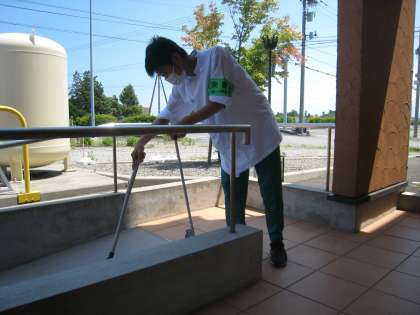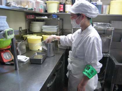 四川乃華 飯野店での活動が始まりました。まずは、制服に着替え、お店の掃除です。盛り付けの説明を受け、実際にやってみます。何事も初めてですが、丁寧に行っています。
