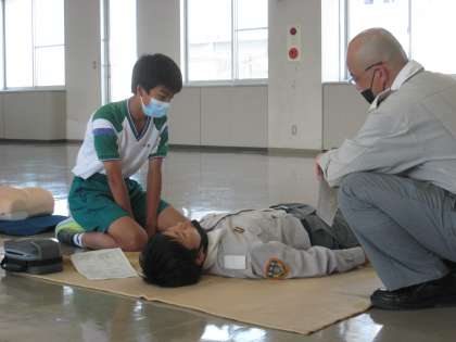 「社会に学ぶ『14歳の挑戦』」 その34 公開日 2022/07/07 更新日 2022/07/07 14歳の挑戦 富山北消防署での活動です。心肺蘇生法体験で、呼吸の有無を観察・確認しています。見ているほうもドキドキしますね!