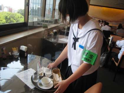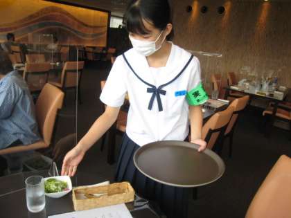 「社会に学ぶ『14歳の挑戦』」 その37 公開日 2022/07/07 更新日 2022/07/07 14歳の挑戦 富山電気ビルレストラン県民会館店での活動です。 エレベーターを降りると、3人が出迎えをしてくれました。料理の配膳やテーブルの片付けを丁寧に行っていました。