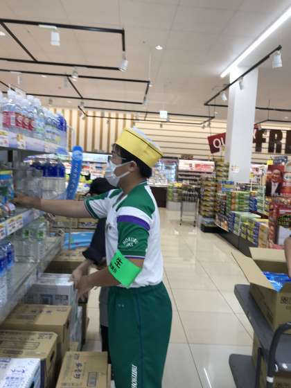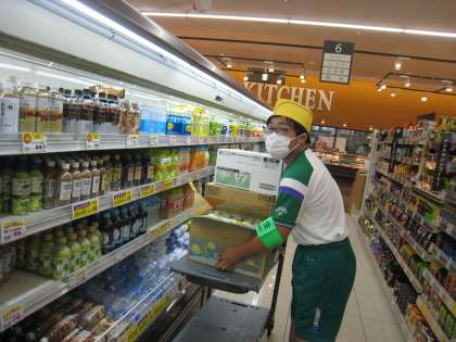 商品を慎重に運んで、お客様が取りやすいように並べています。