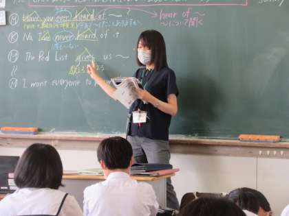 英語の授業です。 どんな動物が絶滅の恐れがあるか、会話から読み取りました。