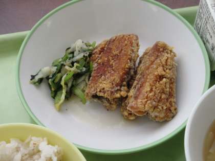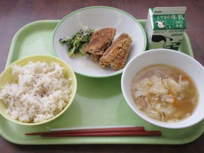 今日の給食 公開日 2022/07/14 更新日 2022/07/14 北中NEWS 麦ご飯の食物繊維は白米の17倍! さばの効果で血液サラサラ!おかげで、北中生は元気いっぱい! 麦ご飯 牛乳 梅肉和え さばの竜田揚げ ワンタンスープ