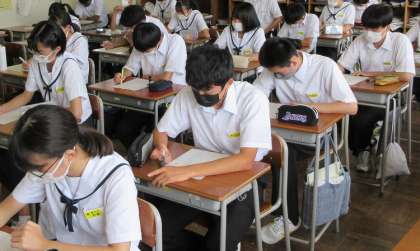 総合的な学習の時間です。 人権作文を聞いて、人権に関する標語を作成しています。