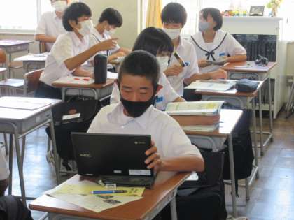 さいころトーキング、話がはずんでいます。クロムブックで何かを調べている人もいました。