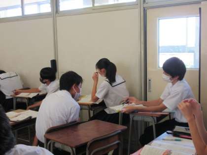 英語の授業です。 「〜してほしい」の作文を考えています。周りの人と相談して、思いついたかな。