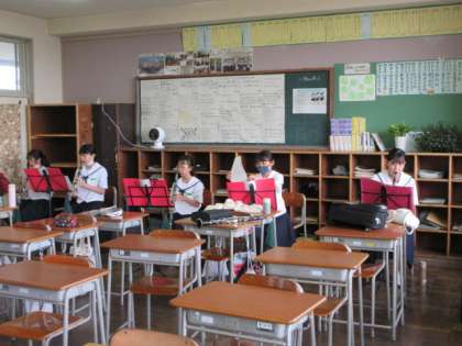 吹奏楽部は、教室等に分かれてパート別に練習中。密にならない工夫をしていました。