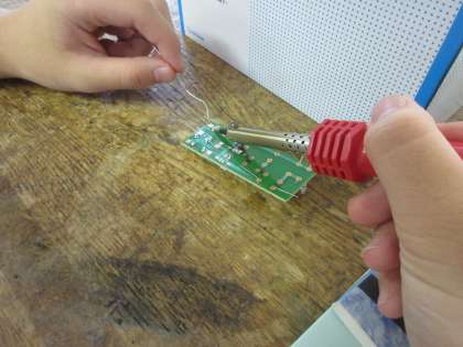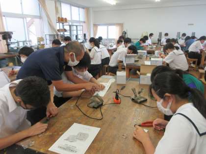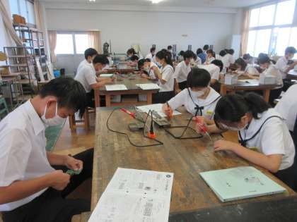 技術・家庭科の授業です。 電子部品をはんだ付けしました。