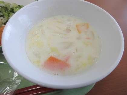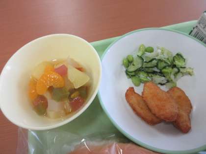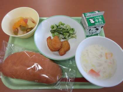 今日の給食 公開日 2022/09/05 更新日 2022/09/05 給食 2学期初のパン給食です。 そのまま食べるか、クリームスープにつけて食べるか・・・。 コッペパン 牛乳 チキンナゲット えごまドレッシングサラダ 白いんげん豆のクリームスープ フルーツカクテル