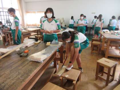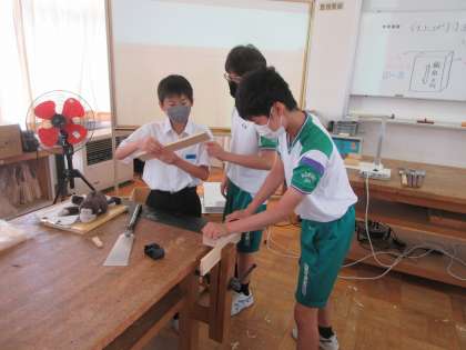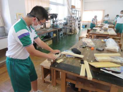 技術・家庭科の授業です。 木工で、本立てをつくります。