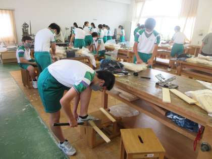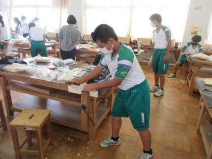 技術・家庭科の授業です。 木工で、本立てをつくります。 なかなか腰の入った、いいかんながけです!!