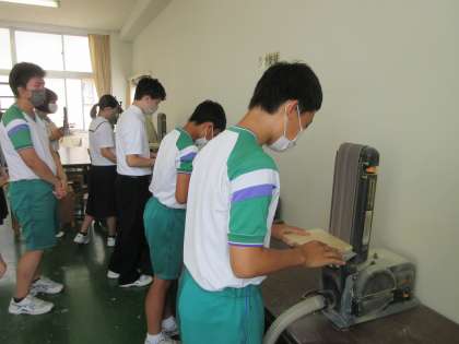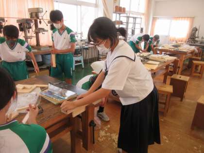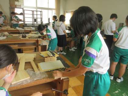 技術・家庭科の授業です。 木工で、本立てをつくっています。