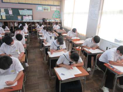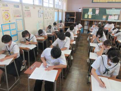 3年生が、確認テストを行いました。 今日は、国語と英語に取り組みました。