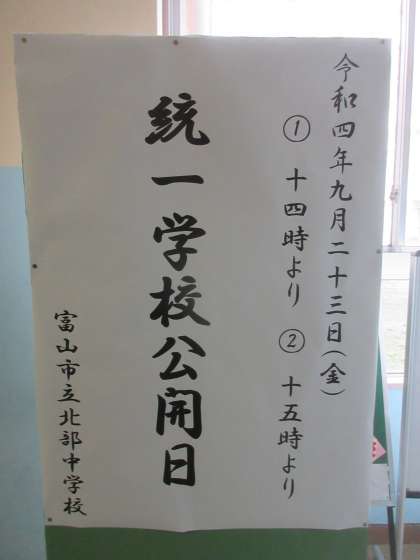 富山市中学校統一学校公開日 公開日 2022/09/23 更新日 2022/09/23 北中NEWS 午後から統一学校公開日を実施します。 小学校6年生の皆さん、その保護者の皆さん、お待ちしております。 詳しい内容は、このHPに記載しています。