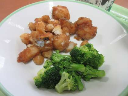 予行練習のあと、しっかり食べて、元気復活!! ごはん 牛乳 魚とひよこ豆の甘からめ ゆでブロッコリー 沢煮椀 冷凍リンゴ