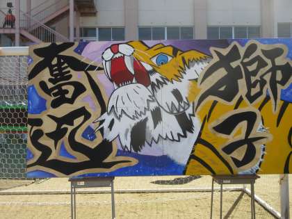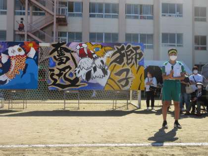 第76回体育大会 その31 公開日 2022/09/29 更新日 2022/09/29 学校行事 午後の部がスタートしました。 団演舞の前に、各団のデコレーション紹介をしました。 悍虎団です。 「虎の強さとダイナミックな文字を工夫しました。」