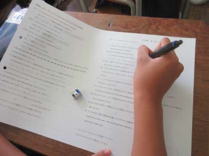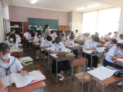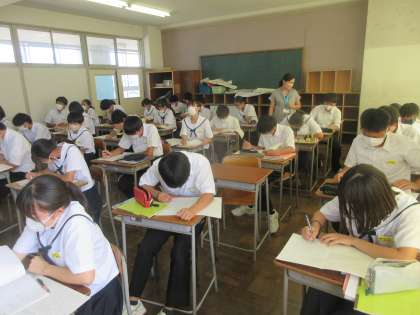 英語の授業です。 中間評価に向けて、対策プリントに取り組みました。
