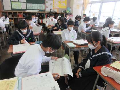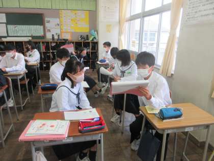 英語の授業です。 ペアになって、「クイックQ&A」を行いました。