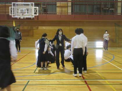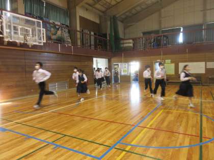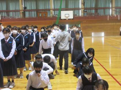 今日の避難場所は、体育館。 教科担任が、肩をたたきながら人員確認を行います。