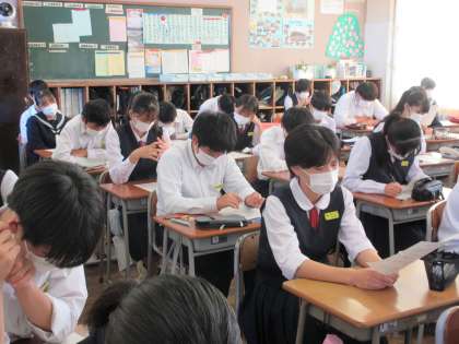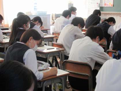 3−1 公開日 2022/10/13 更新日 2022/10/13 第3学年 明日の高校説明会を前に進路学習をしていました。 いよいよ進路を考える時期になりました。 担任の先生の話を真剣に聴き、メモをしています。