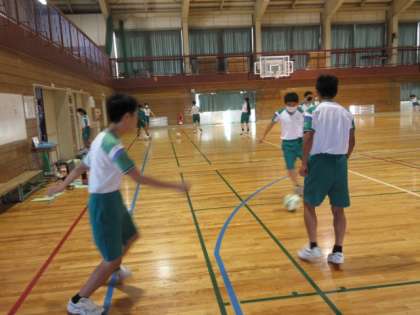 サッカーをしました。パスをする方向を考えながら取り組みました。