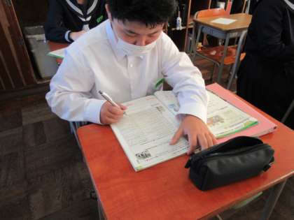 1−3 公開日 2022/10/14 更新日 2022/10/14 第1学年 英語の授業です。 後ろからの修飾について学習しました。 The boy in black yukata is Kaito. 浴衣の中に人がいるから"in"です。それを自然に訳すと「着る」です。