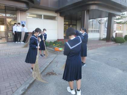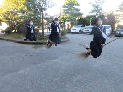 校庭の木々が葉を落とし始めました。 と、そのとき、上空からほうきに乗った「落ち葉掃き隊」が登場しました。