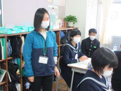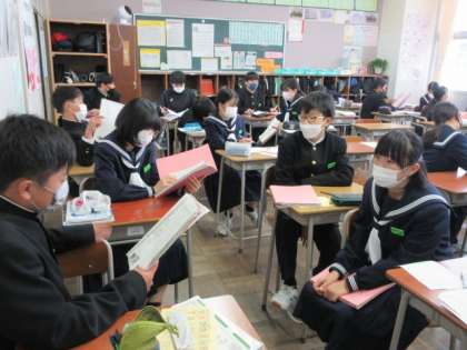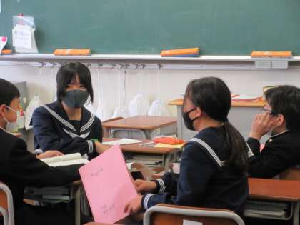 英語の授業です。 班の人と単語の練習中。 音読しながら、覚えます。