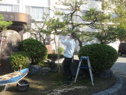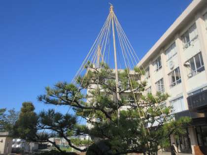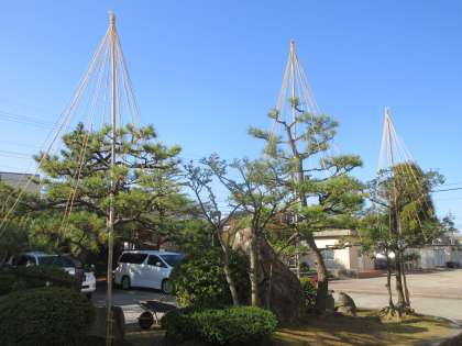 青空に美しい雪囲いが映えます。 これも日本の伝統です!!