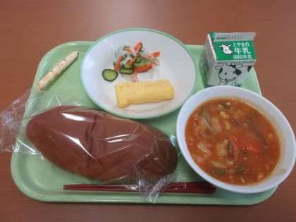 野菜のうまみと豚肉のうまみが、見事にミックス!! 黒糖コッペパン 牛乳 卵ロール 大根サラダ ポークビーンズ 棒チーズ