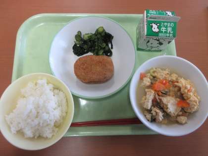 「里芋コロッケ」のねっとり感がたまりません!! ごはん 牛乳 里芋コロッケ 酢の物 炒り豆腐