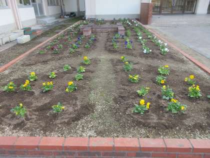 昨日、ボランティアの生徒たちが、パンジーとビオラを植えました。