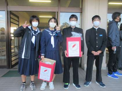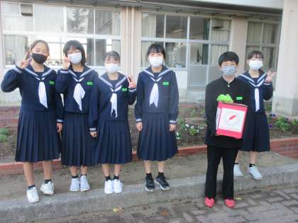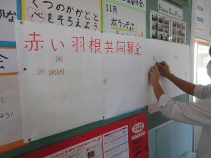 あいさつ運動中に、「赤い羽根共同募金」を呼びかけています。 募金をしてくれた人はシールをはります。。
