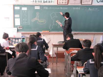 2−1社会の授業です。 黒板を見ながら、真剣に地図を書いています。