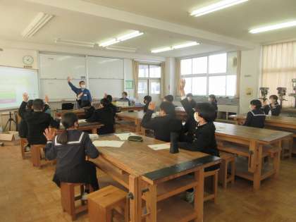 働く人に学ぶ会(1年生) 公開日 2023/02/09 更新日 2023/02/09 第1学年 5、6限に、1年生が、「働く人に学ぶ会」を行いました。 8事業所から講師をお招きし、それぞれ2事業所からお話を聞きました。 (株)村田製作所から 坂森 史隆 様に、ご講演いただきました。
