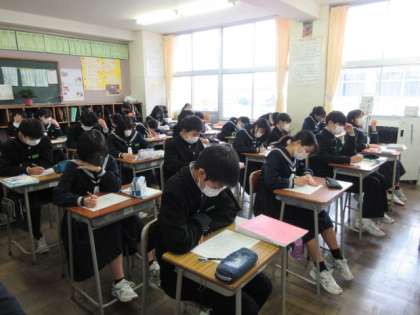 1年生の授業(その2) 公開日 2023/02/13 更新日 2023/02/13 第1学年 1−2英語、1−3国語の授業です。 先生の話に興味津々の様子と、 黙々と漢字テストに取り組んでいる様子です。