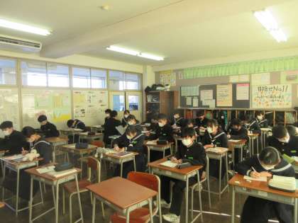 1−4数学、1−5英語の授業です。 1年間の締めくくりの学年末評価です。家庭学習も充実させましょう。