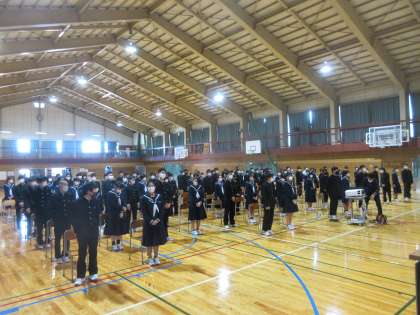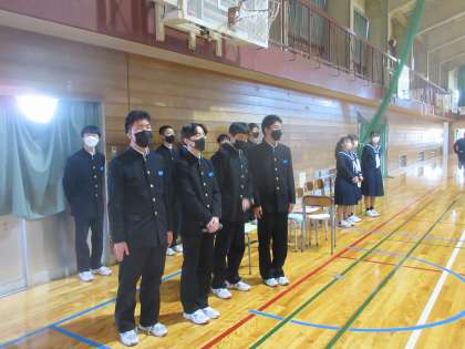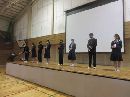プチ合唱コンクール(2年生) 公開日 2023/03/07 更新日 2023/03/07 第2学年 学年生徒会企画「プチ合唱コンクール」を行いました。 卒業式に向けて、「立派な校歌を歌い、3年生を送りだそう!」の目的で、各クラスで練習してきました。 まずは、来年度の修学旅行に向けて、実行委員の紹介を行いました。