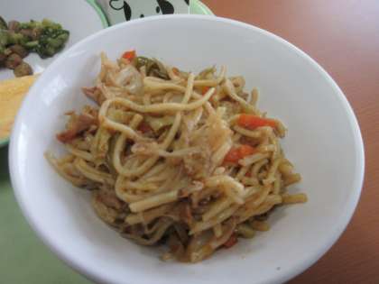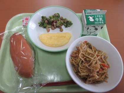 安定のおいしさ、「焼きそば」です。 コッペパン 牛乳 焼きそば オムレツ ビーンズサラダ ポケットチーズ