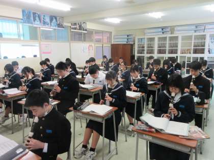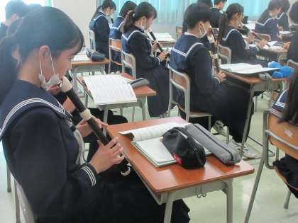 2−4音楽の授業です。 「笑点」のテーマソングをアルトリコーダーで練習しています。 結構、難しそうです。